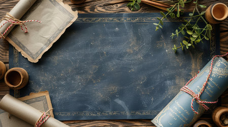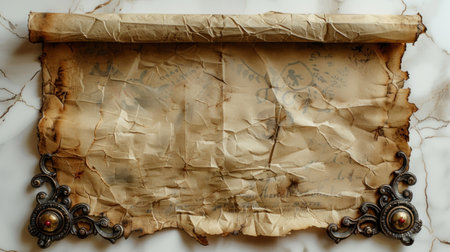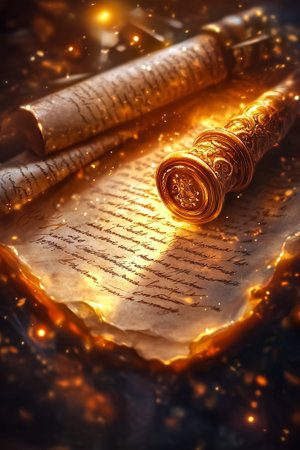 An aged scroll rests upon a weathered wooden surface, showcasing an antique aesthetic. The scroll is framed by detailed, golden embellishments, featuring intricate designs. The lighting highlights the textures of the parchment and wood. Suitable for various editorial and commercial applications.