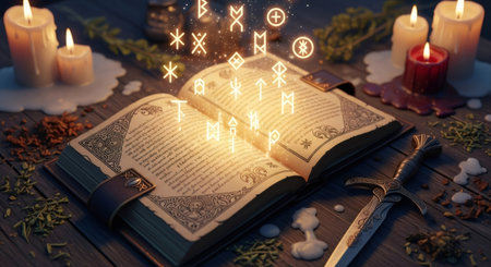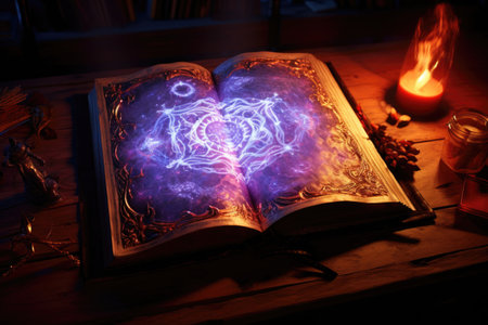 Ancient spellbook with glowing symbols illuminated by candlelight on a dark wooden table