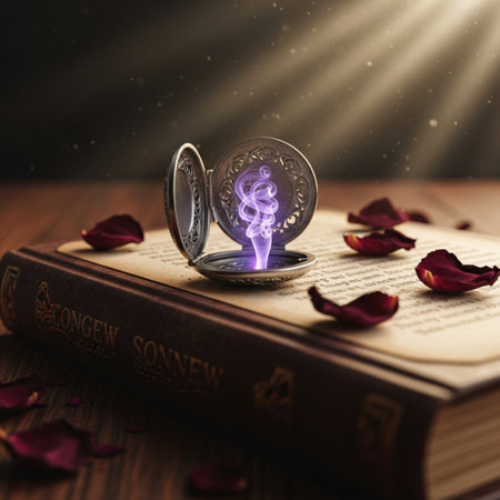 An open, sparkling book lies on a rustic table surrounded by soft candlelight and gentle, glowing fairy lights at night