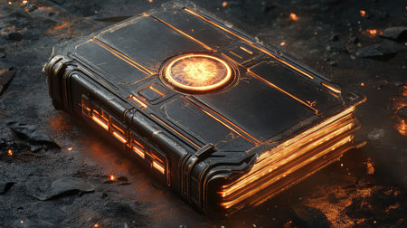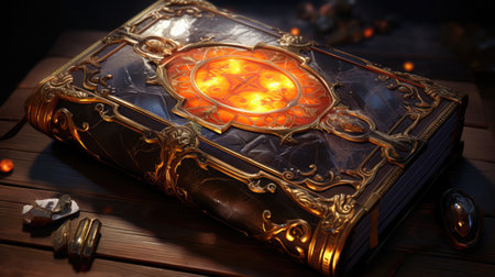 A magic book with a glowing orb in the middle. The book is old and has gold lettering