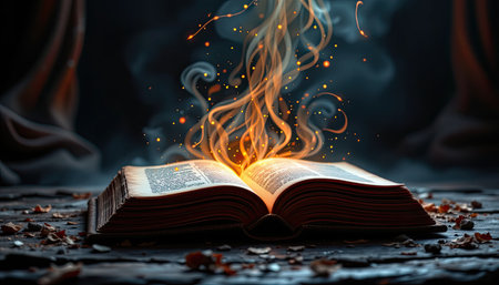 An old book lies open, glowing with flames around its edges, creating a dramatic and mystical atmosphere.