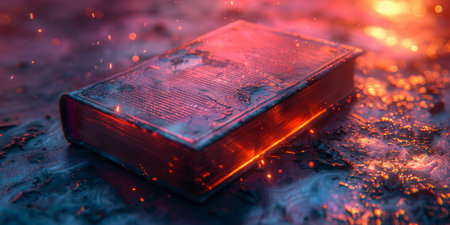 Enchanted old book glows with neon pink and blue hues, evoking magic and mystery