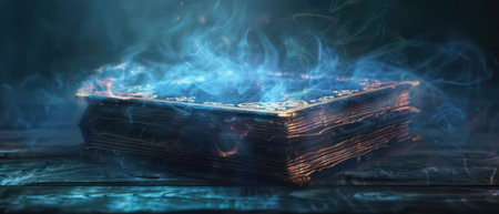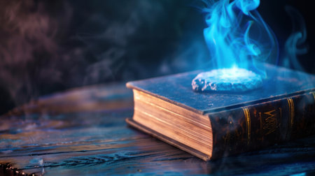 A captivating image of an open book surrounded by blue, glowing smoke, resting on a weathered wooden surface, evoking a sense of mystery and magic.