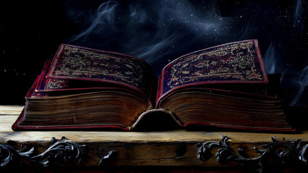 An ancient open book rests on a rustic wooden table illuminated by soft light and surrounded by hints of smoke and mystery