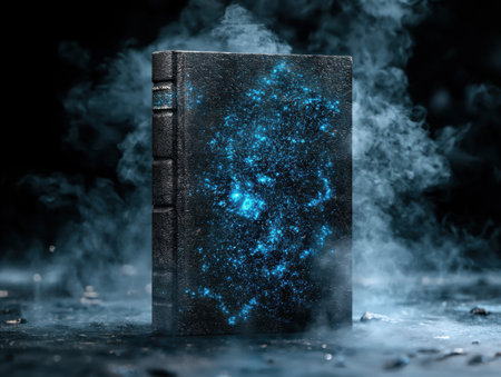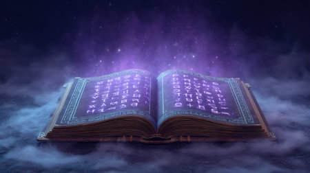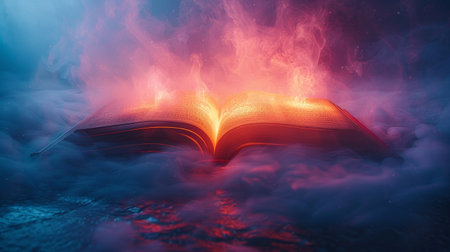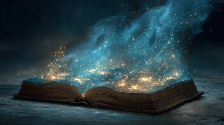An enchanting open book reveals glowing pages filled with mystical symbols, surrounded by ethereal fog and twinkling stars, evoking a sense of wonder and imagination.