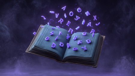 An ethereal image of an open book with floating purple letters. This mystical scene evokes feelings of imagination, creativity, and the magic of storytelling.