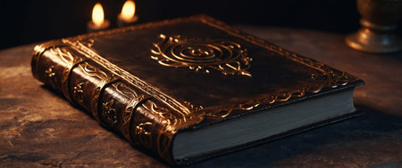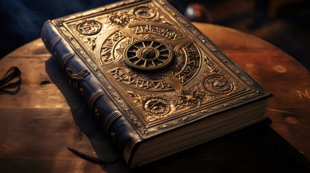 An old magic book, with a cover that is dotted with mystical symbols and signs, reveals its magic to you