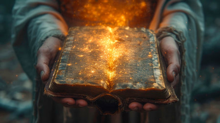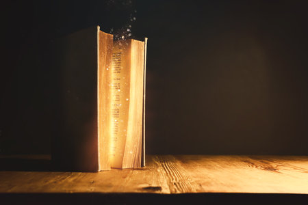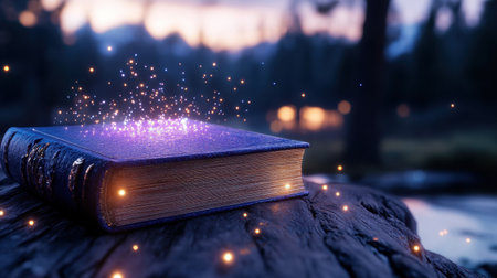 An ancient, glowing book lies on a wooden table, illuminated by shimmering light during a mystical evening