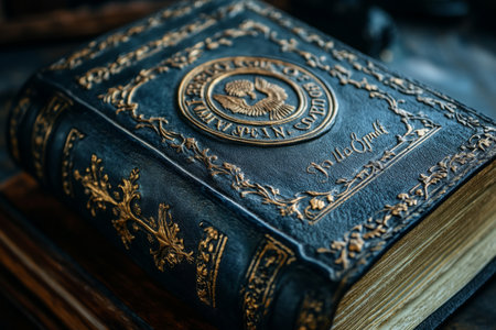 A vintage leather bound book adorned with a presidential seal is displayed on a wooden table in a softly lit study.