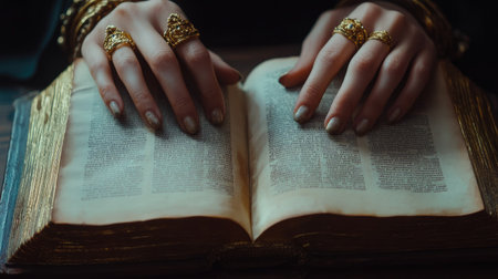 Beautifully adorned hands resting on an open book with gold jewelry sparkling in natural light, suitable for posters or banners.