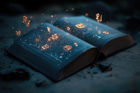 An open book reveals an enchanting display of glowing symbols and text in a dark setting, representing the fusion of knowledge and imagination in art.