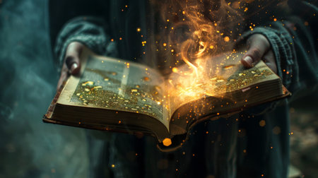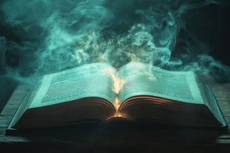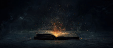 Mystical open book with sparks and smoke in a dark room with dramatic lighting.