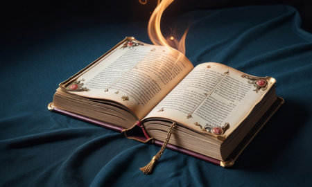 Ethereal flames dance across an open book on a mystic blue fabric, symbolizing the fusion of mysticism and knowledge. The image portrays the enchanting power of literature.