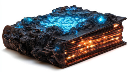 Wizard book of spells with glowing blue inscriptions, isolated on white, ideal for fantasy and magical concepts