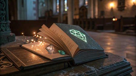 This image features an ancient book with intricate symbolic engravings, illuminated by a mysterious green light. The textured surface evokes a sense of mystique and magic, ideal for themes of lore and ancient artifacts.