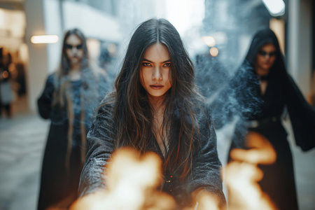 Under a dark, foggy sky, a witch dressed in flowing garments raises her hands as vibrant flames dance around them, casting an alluring glow amid the Halloween magic.