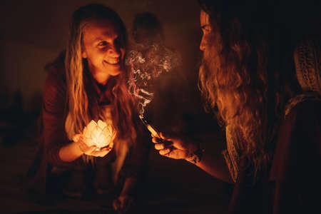 incense in a woman hand, ceremony space.