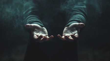 Capturing the essence of magic through hands displaying glowing particles in a dark setting during a mysterious evening
