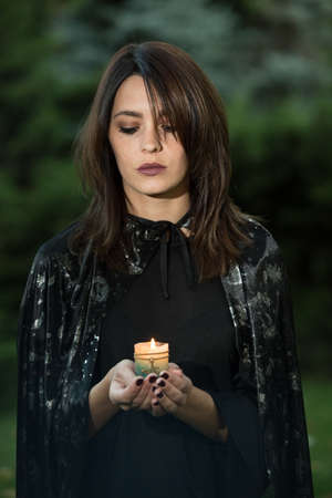 Portrait of an attractive young woman in a black dress with a cape. In the hands of a burning candle. A girl with dark hair and brown green eyes and makeup.