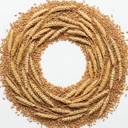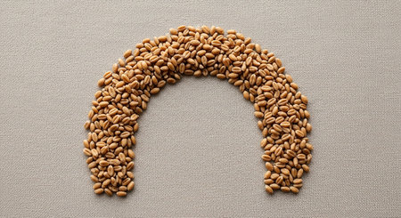 Wheat grains are carefully arranged in a perfect semicircle shape on a light beige textured surface.