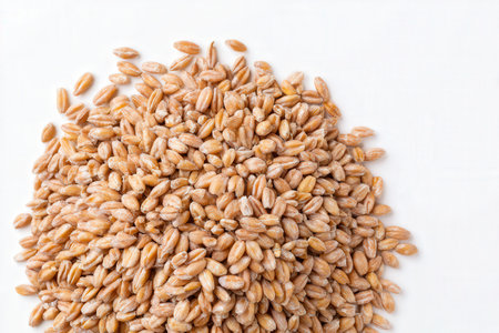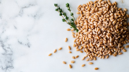 A vibrant image showcasing a pile of organic farro grains with a fresh sprig, beautifully arranged on a marble surface. Ideal for health and culinary themes.