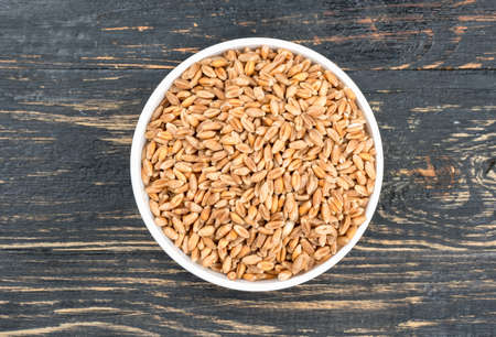 Top view of a small bowl filled with organic whole grain spelt on a wood table top illuminated with natural light.