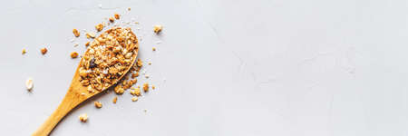 Muesli or granola on gray background. Healthy food concept. Banner with copy space for text.