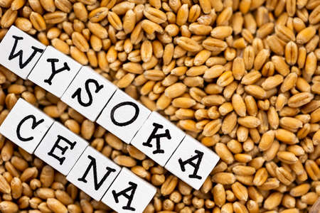The wording High price translated as High price composed on the background of bulk wheat grain. High price of cereals. Scene lit by uniform, soft light.
