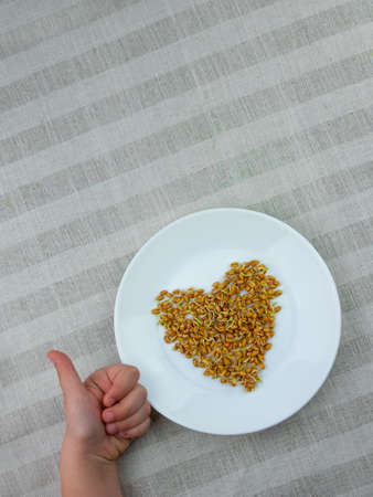 sprouted grains of wheat in shape of heart on white plate. black background with copy space. healthy food concept