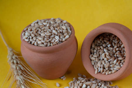 Uncooked spelled in bowl on colored background, ,cereal grains ,