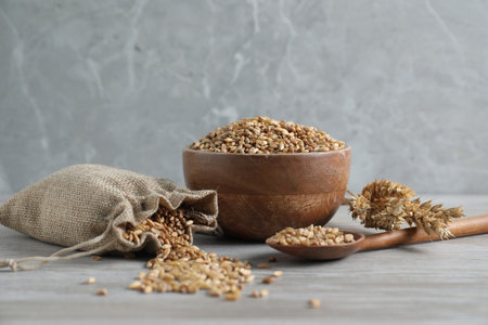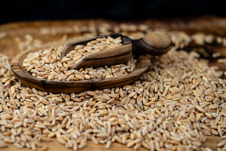 Wholegrain uncooked raw spelt farro in linen napkin with wooden scoop on a wooden background, close up