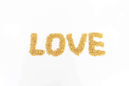 Word GO written with buckwheat On gray background, top view, copy space. Food supplies crisis, food donation on quarantine isolation period.