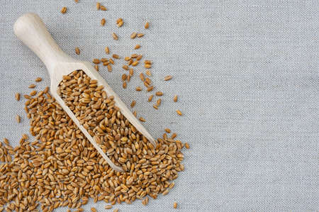 Whole wheat grain kernels on burlap background. Wheat grains agricultural background. Harvest, cereal grains wooden spoon