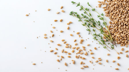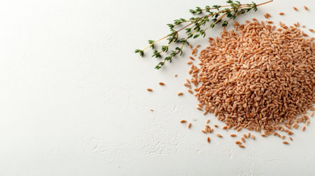A scattering of farro grains accompanied by a fresh herb sprig, set against a light background. Perfect for showcasing healthy ingredients and rustic cooking themes.