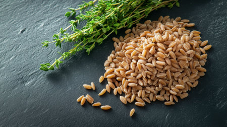 Fresh organic farro grains arranged in a pile with a sprig of herbs, perfect for showcasing healthy eating or cooking ingredients in a rustic setting.