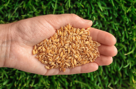 Close up of male hands holding small amount of wheat seeds. Lack of food and hunger concept