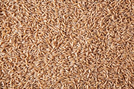 Pile of unpeeled oat grains on wooden background, top view, close-up, macro, selective focus, shallow depth of field. Some copy space. Dietary food. Healthy eating, dieting. Natural nutritious oatmeal. Vegan cuisine. Organic food concept.