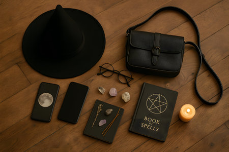 Witch-themed flat lay with hat, smartphone, crystals and spellbook on wooden floor – AI generated