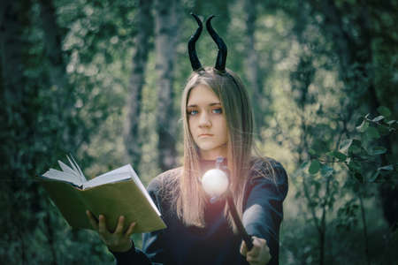 A young girl with long hair in a witch costume, with a staff in her hands, conjures a book. Halloween, selective focus, smoke in the woods. Tinting for an old photo with a grainy overlay