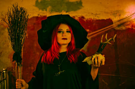 Witch in a red-haired hat. halloween concept