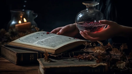Generative AI, witch with magic book and cauldron making poison or love potion