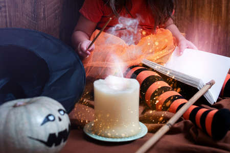 Child in the witch costume learns to do magic on Halloween