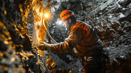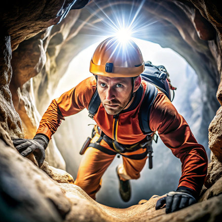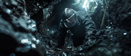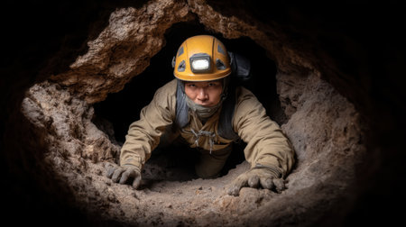 A determined miner navigates a narrow cave tunnel, wearing protective gear and a headlamp, showcasing the thrill of underground exploration and adventure in nature.