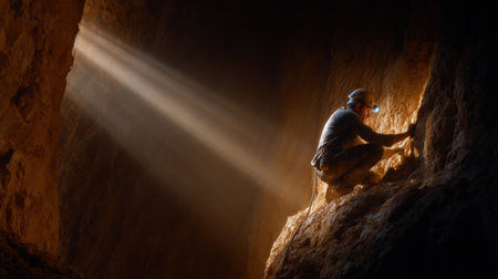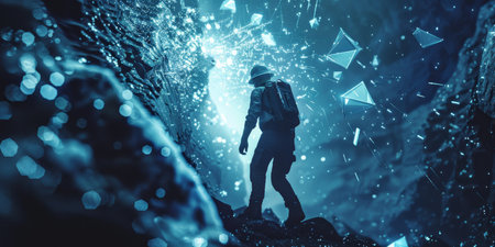 A solitary figure stands illuminated in a dark cavern, delving deep into the secrets of nature waiting to be discovered. Generative AI