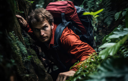 Standing amidst lush greenery, a hiker gazes upward, dwarfed by towering trees. Sunlight filters through the canopy, illuminating the vibrant foliage and creating an atmosphere of adventure.
