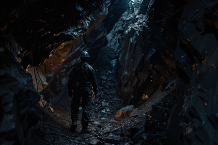 Miners navigate a dark, rugged underground tunnel illuminated by a single light. The air is thick with mystery as they delve deeper into the earth's secrets, equipped for adventure.