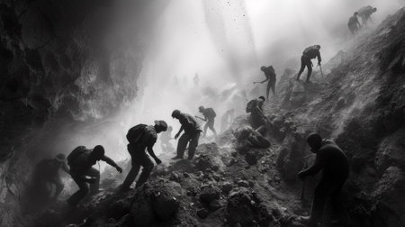Mining team in a tunnel illuminated by headlamps, symbolizing unity and focused work in the depths.