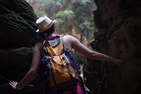 A tourist mountaineer climbs up through a narrow gap in mountains. Mountain hiking, active lifestyle. Extreme sport.