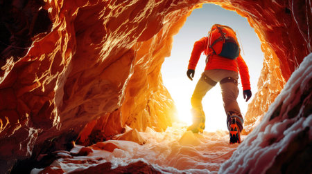 An adventurer exits a vivid orange cave into the snow, bathed in warm light