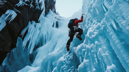 A climber skillfully scales a frosty rock face amid snowy surroundings demonstrating determination and expertise in challenging conditions.